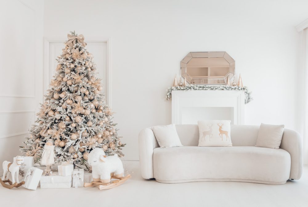Letisztult, klasszikus stílusú tér modern részletekkel, a fehér árnyalatinak hideg/meleg színkombinációival